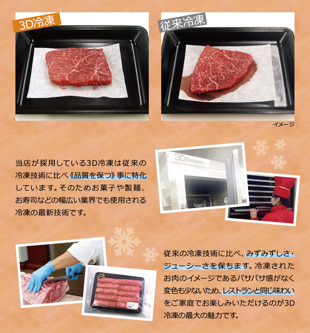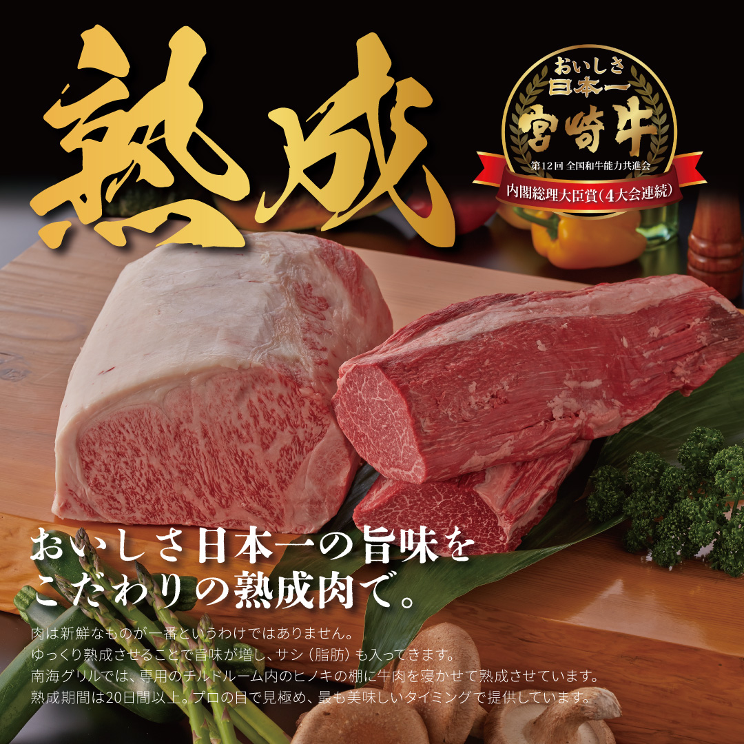 安全で安心な宮崎牛を独自製法±0℃のチルドルームで約20日前後(ウェットエイジング)熟成し、一番美味しい状態で提供いたしております。