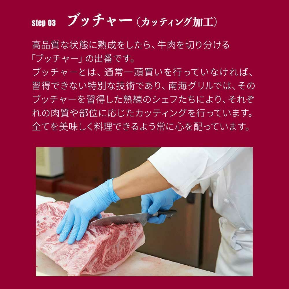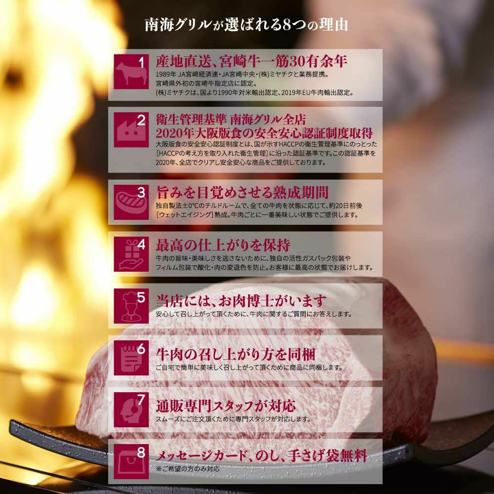 安全で安心な宮崎牛を独自製法±0℃のチルドルームで約20日前後(ウェットエイジング)熟成し、一番美味しい状態で提供いたしております。