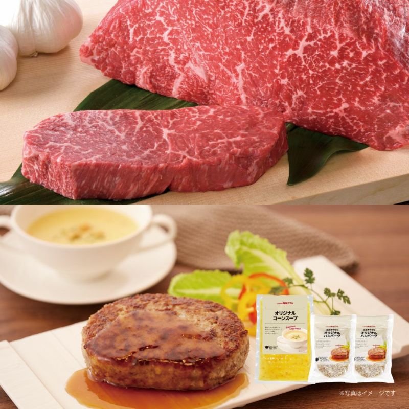 宮崎牛A4赤身ステーキ(150×1) + オリジナルハンバーグ×2 + コーンスープ(2人前)