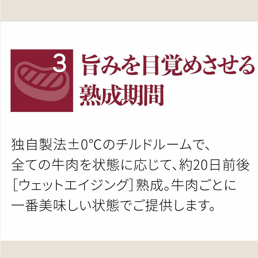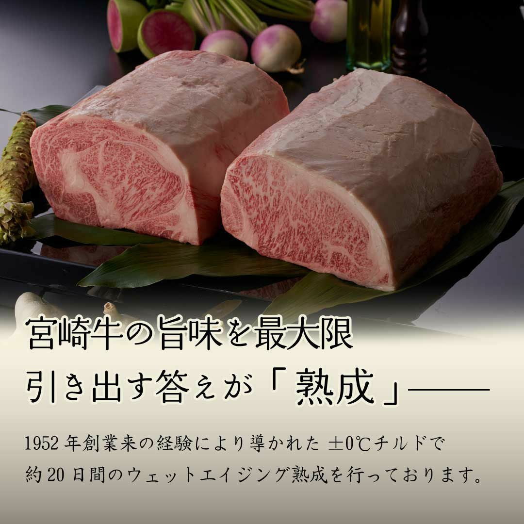安全で安心な宮崎牛を独自製法±0℃のチルドルームで約20日前後(ウェットエイジング)熟成し、一番美味しい状態で提供いたしております。