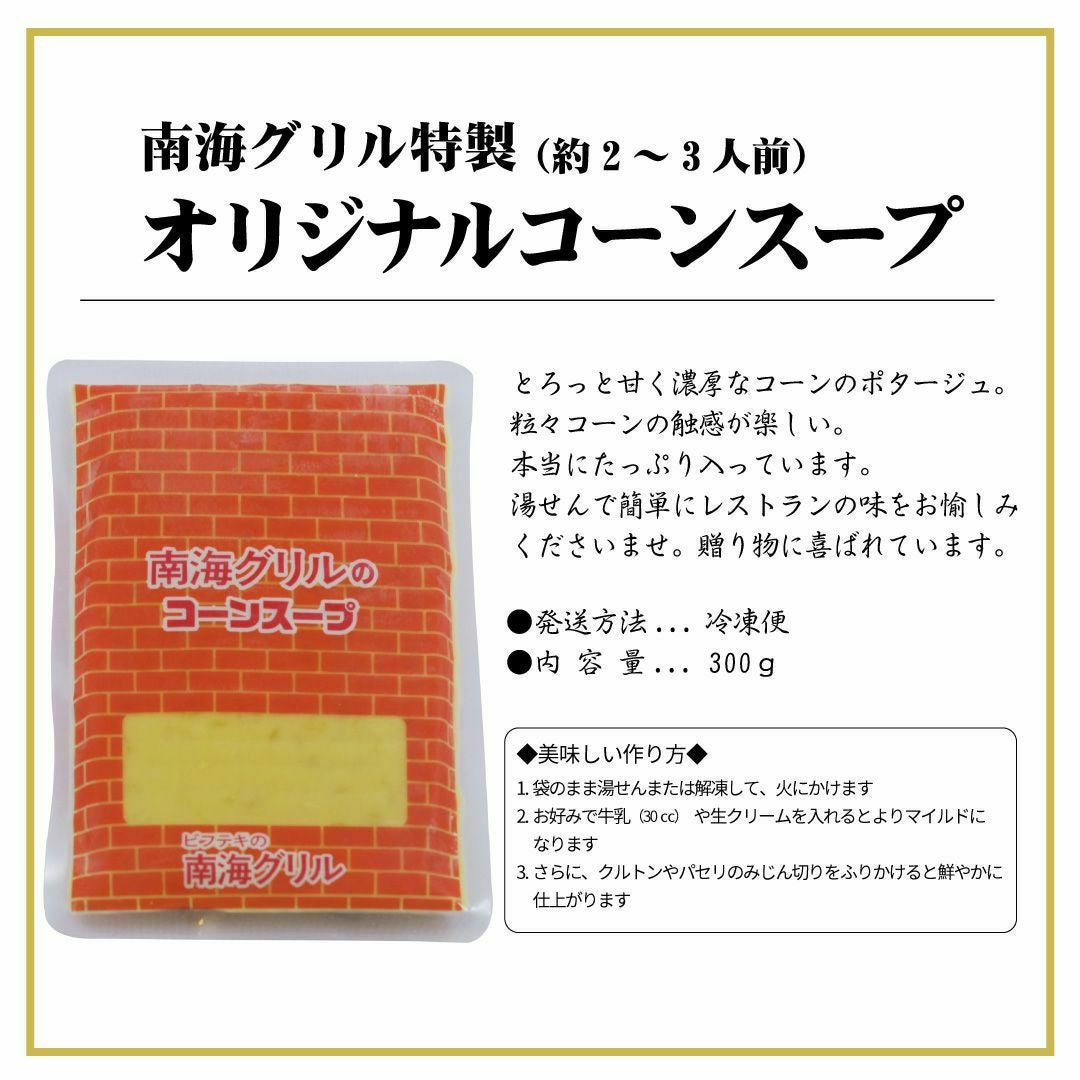 他の画像を見る 【新生活応援キャンペーン対象商品】 オリジナル「コーンスープ」 5パック【冷凍】 のし対応◎ メッセージカード◎ ギフト◎ 各種決済対応◎ 送料無料!! クール便でお届け 定価 ¥ 3,800 のところ 当店特別価格 ¥ 3,420 税込 販売を終了しました。 詳細を見る お気に入りに登録する